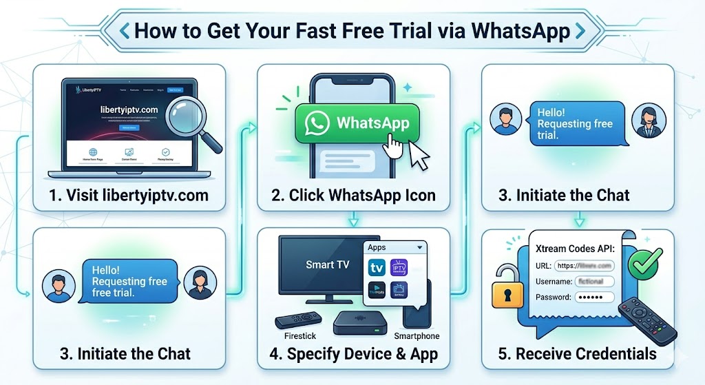2. Is the WhatsApp free trial completely free? Yes, a genuine Chat for IPTV test is 100% free. Providers like LibertyIPTV offer a no-obligation 24-hour trial so you can experience their premium channel lineup and VOD library before committing to a paid subscription. No credit card is required for the trial.