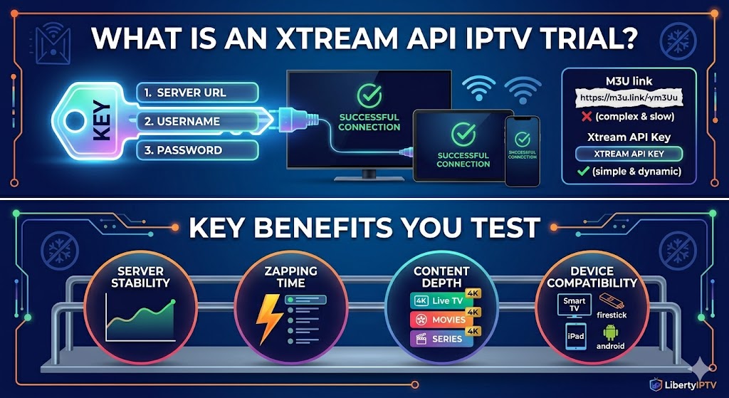 Addressing the core of what you are searching for: if you want seamless integration, rapid setup, and access to an endless library of content without committing blindly, an Xtream API IPTV trial offers the perfect testing ground. Instead of dealing with clunky, endlessly long M3U playlist URLs, the Xtream API streamlines the process, requiring only a server URL, a username, and a password. To see exactly how transformative this technology is, you can claim an instant free IPTV trial with LibertyIPTV, the industry leader in premium streaming quality and stability.